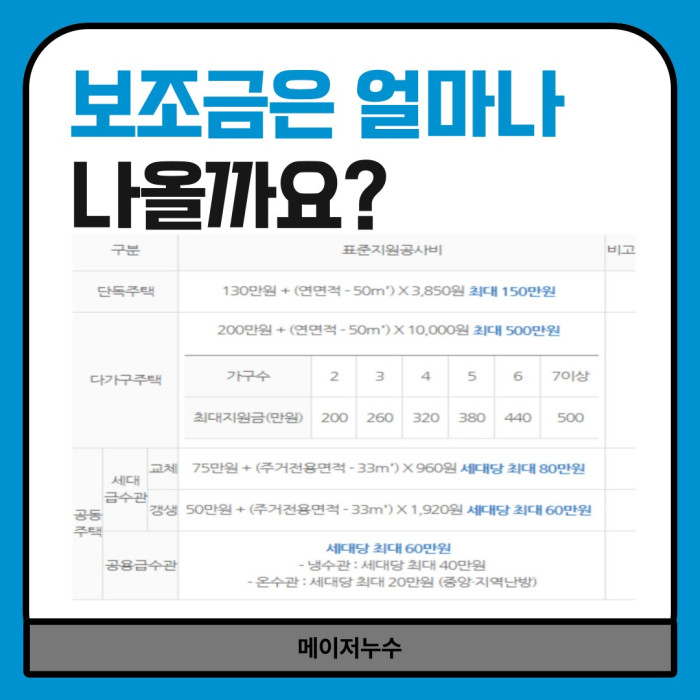 | 세대 급수관 갱생 | 50만 원 + (주거건용면적 - 33㎡) × 1,920원 → 세대당 최대 60만 원 | |